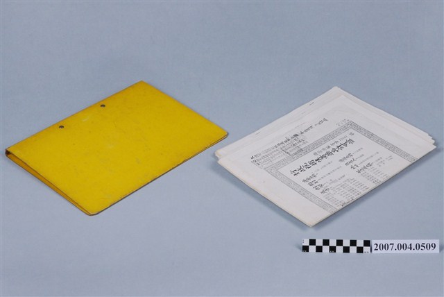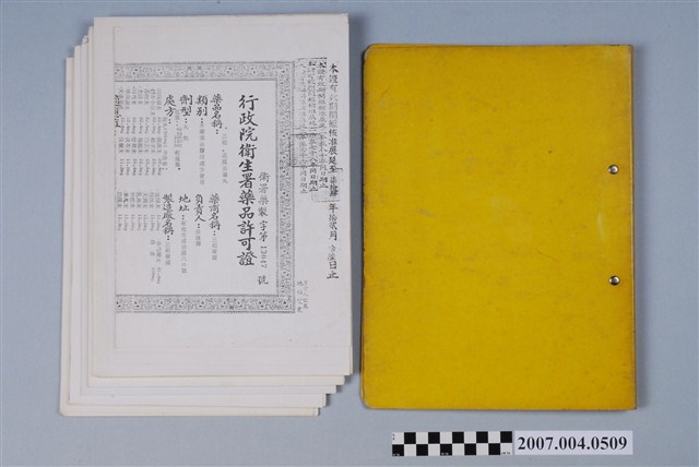 本物件為三和藥廠三和追風去濕丸文檔。共有5項文件,夾在黃色資料夾中,資料夾封面有手寫之三和追風去濕丸字樣。
