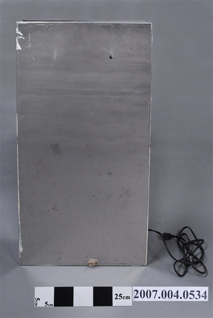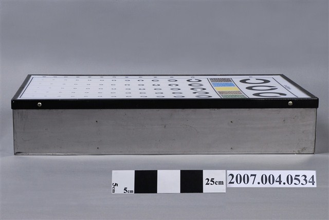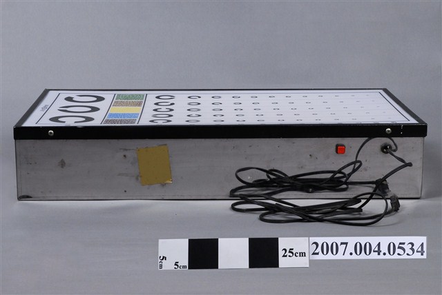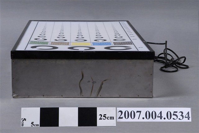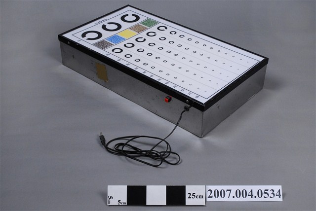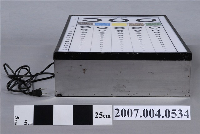 本物件為正光式視力表。此儀器有插頭與按鈕。儀器正面最左邊有一排數字,為0.1、0.2、0.3、0.4、0.5、0.6、0.7、0.8、0.9、1.0、1.2、1.5和2.0。每個數字對應的行有不同開口方向的C字樣。另有5格不同顏色之點狀色圖。