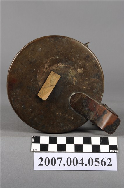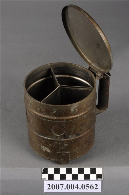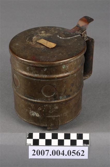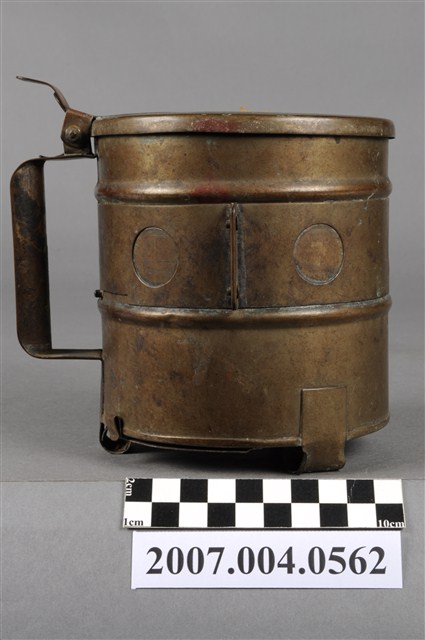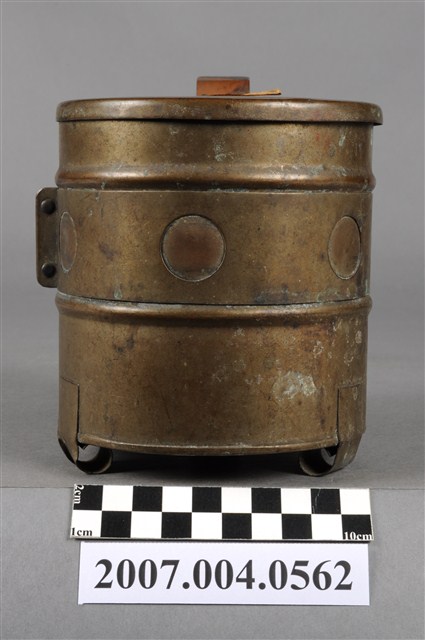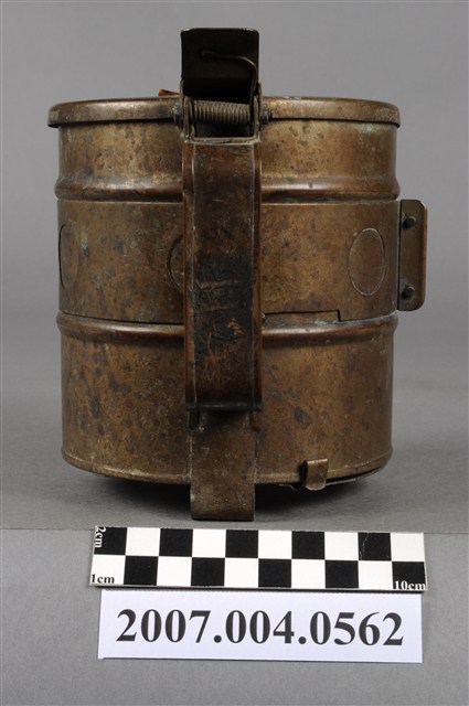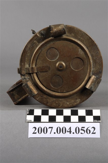 本物件為銅製2號紗布罐。此為放置紗布之用。外觀為圓罐狀,罐身側面有握把。罐蓋頂部有一凸出壓按處,壓下去可打開罐子。罐蓋可以打開,蓋子與罐身無法完全分離,內部空間有金屬擋片分隔。底部有3個腳座。