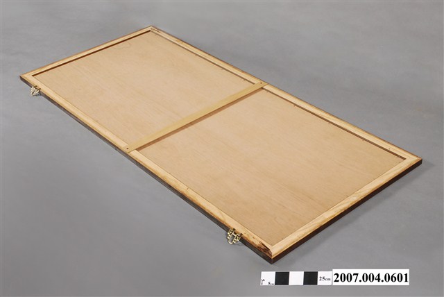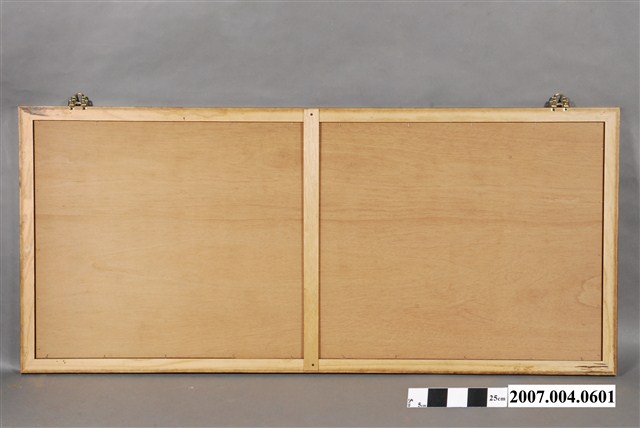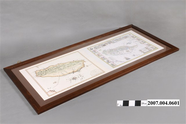 1. 本物件為以福爾摩沙地圖為主題之裱框,框為木製,上方有兩個金色的金屬掛環,其正面有兩幅臺灣地圖,右方地圖為臺灣原住民分布圖,外圖框為黃色,並繪製以三角形為主體的圖騰,內圖框繪製臺灣原住民各族群外貌與服飾,中間為臺灣島嶼圖,繪有島嶼地形、河流、山脈,並標示有地名,以各顏色繪製族群分布範圍,指北針繪製於左上方,右上方有一幅以臺灣周邊東亞地區的地圖,右下方為地圖題名,文字由上至下為「台灣原住民分布圖」、「魏德文編著、邱若龍繪圖」、「MAP of FORMOSAN Aborigines」、「Wei De-Wun, ed.」、「Ciu Ruo-Long, illus.」、「1998」,左右兩側各繪有一尊原住民木雕人像,左下方有標示圖例,以顏色為各族群分類;右方為福爾摩沙島圖,外圖框為黃色,右下角6邊形框中標示地圖題名:「KAART VAN HET EYLAND FORMOSA EN DE EYLENDEN VAN PISCARORES」、出版商「J. VAN BRAAM & G. ONDER DE LINDEN.」、「exci CurnPrivil」,下方繪製有橘黃、黑色、淡藍色相間的比例尺,並標有「Duytsche Mylen 15 in een graad」;左下方有繪製指北針之圖示,中間為臺灣島嶼地形圖,有山脈及部分溪流位置,並標示部分地名,島嶼上標有「HET EYLAND FORMOSA」、下方群島上方標有「PISCA DORES」;背面為木製裱框背面,上方有兩個金色金屬掛環,中間有分隔作用之木條,將左右兩邊分為方形。2. 本地圖的繪製與John Speed西元1627年The Prosect of the Most Famous Parts of World《世界著名各地區展望》收錄的「中華帝國圖」相似,在圖框上描繪了臺灣原住民各族群的外貌造型;其地圖的編著者為南天書局的創辦人魏德文,繪製者為漫畫作品《漫畫.巴萊》的創作者邱若龍。3. 本地圖收錄於荷蘭人François Valentyn編著的Oude en Nieuw Oost-Indën(《新舊東印度誌》)第四分冊中,並由荷蘭書商Jan van Braam與Gerard Onder de Linden合作出版,其地名主要標示位置為沿海一帶。