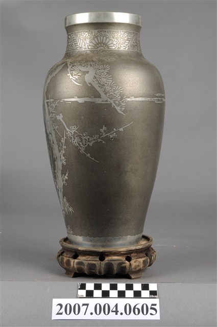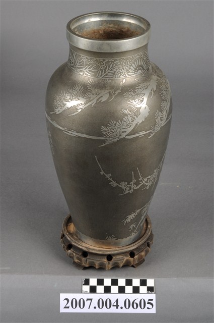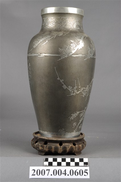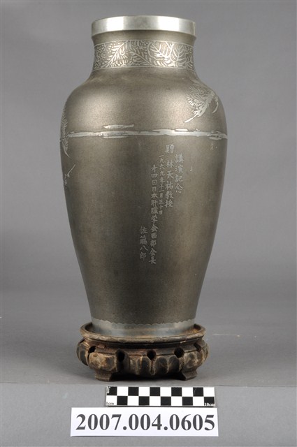 1.佐藤八郎贈林天祐講演紀念花瓶組可分為花瓶與底座2部件。花瓶為以鍍銀材質製作,外型呈圓口短頸,口緣處帶唇,滑肩,器身呈上寬下窄之圓筒狀。表面以磨砂灰色為地,亮銀色作圖案裝飾,於頸部飾有菊花枝葉圖案,器身則以松樹、梅花與竹子,歲寒三友圖為主要圖案。底座為木材製作,頂面作圓形淺碟,中心帶有圓形透孔以及數道同心圓環線,座身側雕刻內凹圓弧以及等距圓形透孔裝飾,底足作四腳立足支撐。2.本件花瓶組為林天佑教授於1969年11月30日至日本演講,由第四屆日本肝臟學會西部會長佐藤八郎敬贈之紀念品。