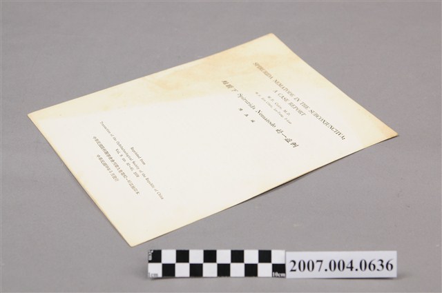 本物件為陳五福著〈結膜下Spirurida Nematode的一症例〉,為中華民國眼科醫學會會刊第九卷第82-85頁抽印本,發行於民國59年5月,內容主要在討論一種寄生蟲寄生於眼睛結膜下的病例,封底空白無圖案,有泛黃痕跡。
