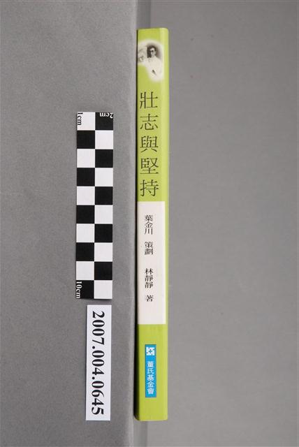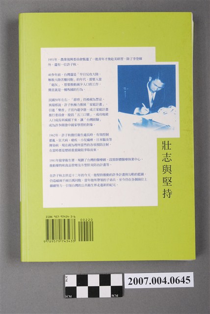 1. 本物件為林靜靜著《壯志與堅持:許子秋與台灣公共衛生》。封面為綠色,有兩張許子秋照片與文字,分別為壯志與堅持、許子秋與台灣公共衛生、葉金川策劃、林靜靜著等字樣,以及許子秋簡介。目錄分為12個章節,每個章節下還有小標題。此書於2002年7月,由財團法人董氏基金會出版。