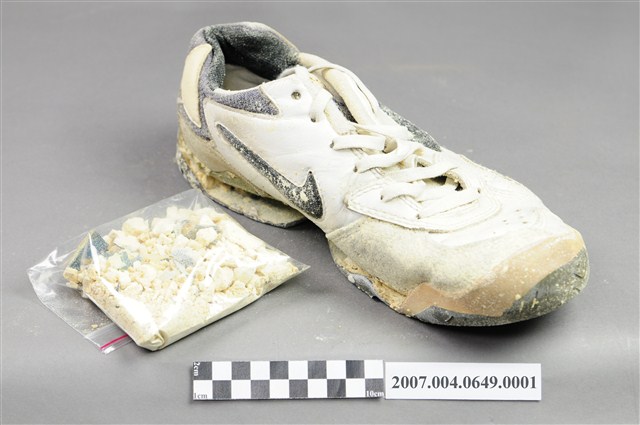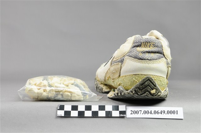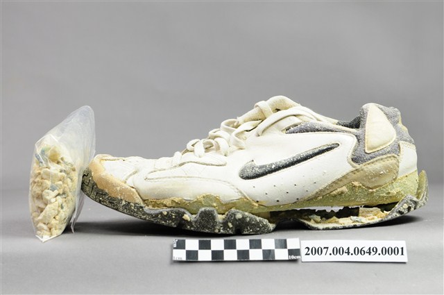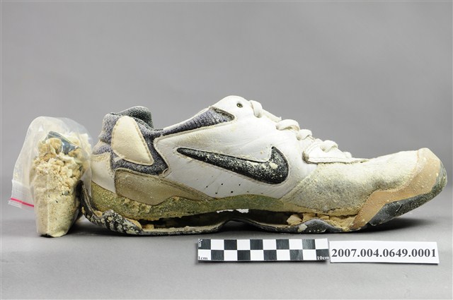 1.本件為耐吉(Nike)運動鞋之左腳,鞋身以白色皮革、灰白色麂皮革及深色織布等材質組合製作,鞋身兩側有該品牌標誌,鞋領口後側也繡有耐吉商標「Air」黃色英文字樣。鞋底部分是耐吉特有的air設計,其中白色PU層因年代久遠分解碎裂,鞋底碎塊裝進透明塑膠袋裡保存。2.林宗義生於1920年,是臺灣腦神經精神醫學的先鋒和奠基人。父親林茂生曾任臺灣大學文學院院長,死於二二八事件。林宗義是臺大醫學院第一位神經精神科教授兼主任,創立臺灣腦神經精神醫學教育的模式。1965年擔任WHO心理衛生部門的研究主任,更於1974年擔任世界心理衛生聯盟主席。2010年逝世於加拿大。