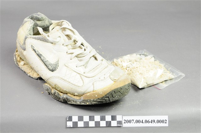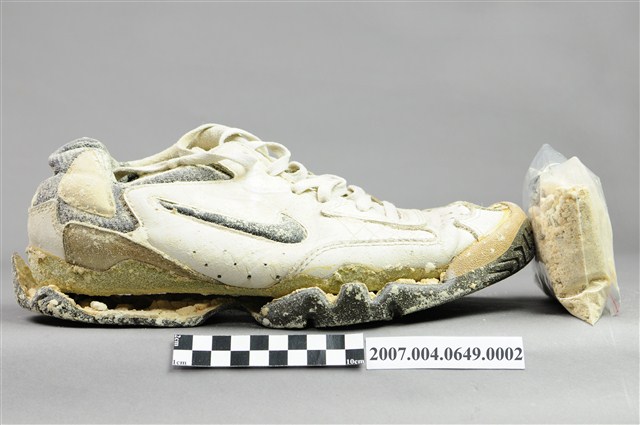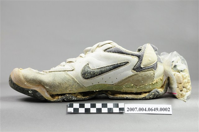 1.本件為耐吉(Nike)運動鞋之右腳,鞋身以白色皮革、灰白色麂皮革及深色織布等材質組合製作,鞋身兩側有該品牌標誌,鞋領口後側也繡有耐吉商標「Air」黃色英文字樣。鞋底部分是耐吉特有的air設計,其中白色PU層因年代久遠分解碎裂,鞋底碎塊裝進透明塑膠袋裡保存。2.林宗義生於1920年,是臺灣腦神經精神醫學的先鋒和奠基人。父親林茂生曾任臺灣大學文學院院長,死於二二八事件。林宗義是臺大醫學院第一位神經精神科教授兼主任,創立臺灣腦神經精神醫學教育的模式。1965年擔任WHO心理衛生部門的研究主任,更於1974年擔任世界心理衛生聯盟主席。2010年逝世於加拿大。