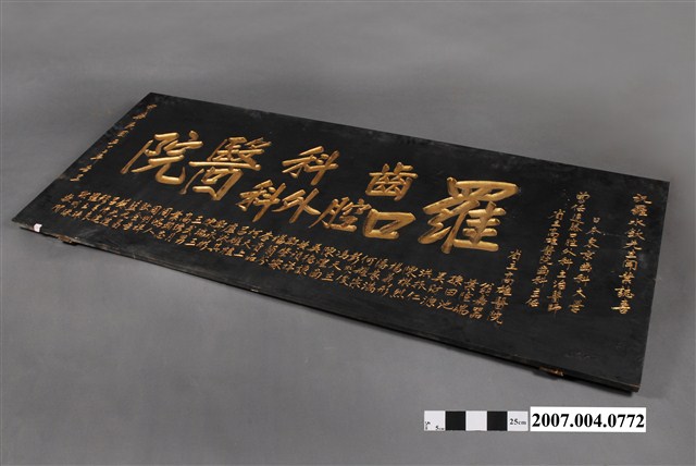 本物件為羅齒科口腔外科醫院匾額。匾額題字為羅齒科口腔外科醫院,是省立高雄醫院34人聯名贈送,祝羅水欽先生開業誌喜。匾額上註明羅水欽曾任日本東京齒科大學、遠藤口腔外科主治醫師、省立高雄醫院齒科主任。日期為中華民國52年吉旦。