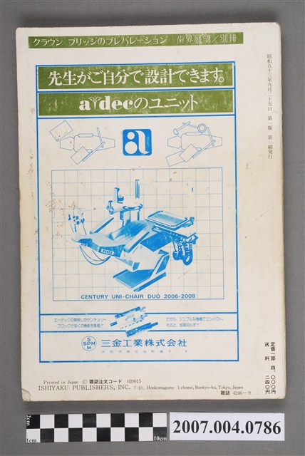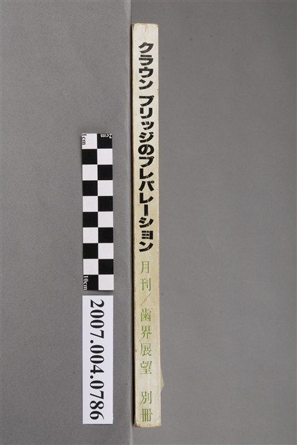 本物件為奥川幸二編《齒界展望別冊:クラウンブリッジのプレパレーション》。封面為白底,上有黑色與綠色文字,以及藍黑灰白綠色塊連結而成的圖案。封面文字有DENTAL OUTLOOK、齒界展望別冊、クラウンブリッジのプレパレーション、醫齒藥出版株式會社。目次分為3大部分,分別為プレパレーションに關する基本事項、基本形成法、ケース プレゼンテーション,即準備工作、基本形成法和案例介紹。本書由醫齒藥出版株式會社,於昭和53年(1978)9月25日發行。