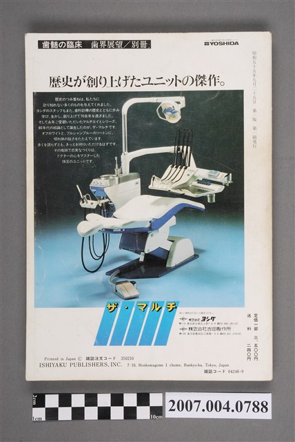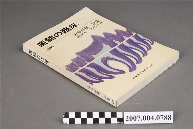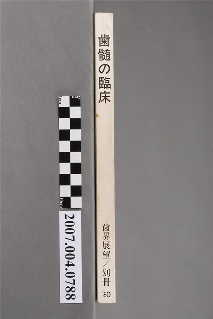本物件為石川達也編《齒界展望別冊:齒髓の臨床》。封面為白底,上有黑色文字,以及由深紫淡紫色組成的牙齒排列圖案。封面文字有DENTAL OUTLOOK、齒界展望別冊、齒髓の臨床、1980、醫齒藥出版株式會社。目次分為10章節,每章下有數篇文章,第4章最多,有11篇文章。本書由醫齒藥出版株式會社,於昭和55年(1980)9月25日發行。