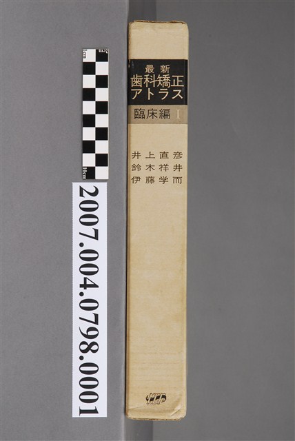 本物件為井上直彥等著《最新齒科矯正アトラス:臨床編Ⅰ》書殼。書殼為紙製品,封面無圖,上有文字。封面文字有井上直彥、鈴木祥井、伊藤學而、最新齒科矯正アトラス、臨床編Ⅰ、醫齒藥出版株式會社。