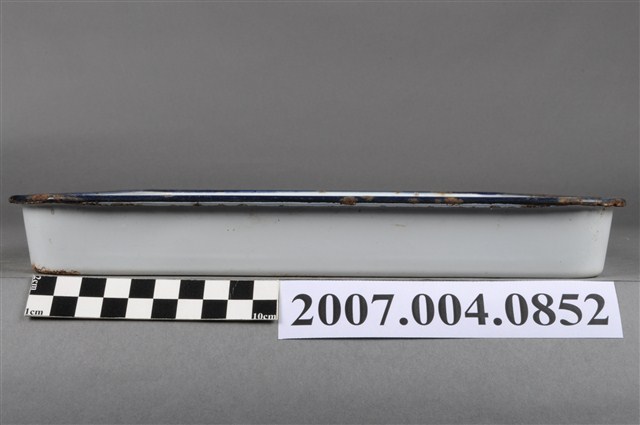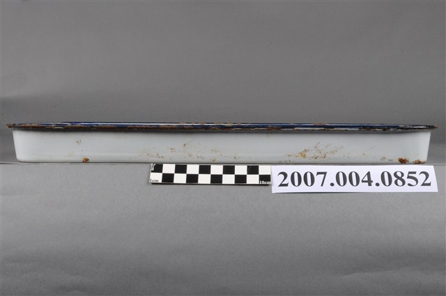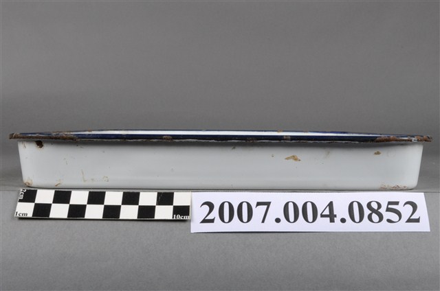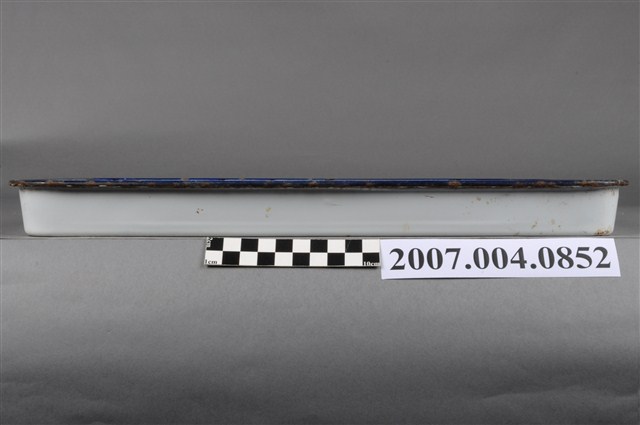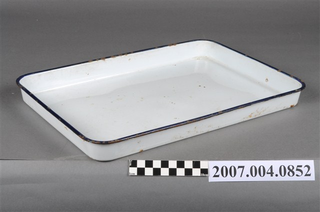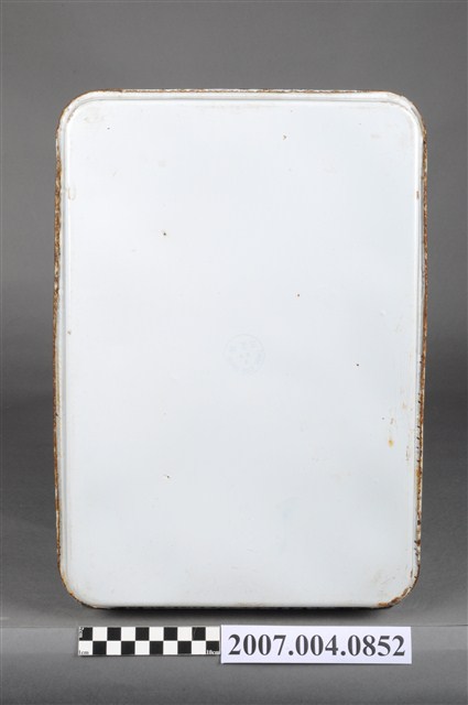 本物件為三星牌搪瓷方盤。方盤為白色,盤邊緣有一圈藍色,底部有一印章標示,上有三星牌、THREE STAR BRAND字樣和3顆星圖案。