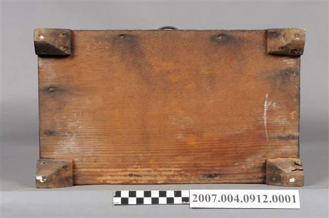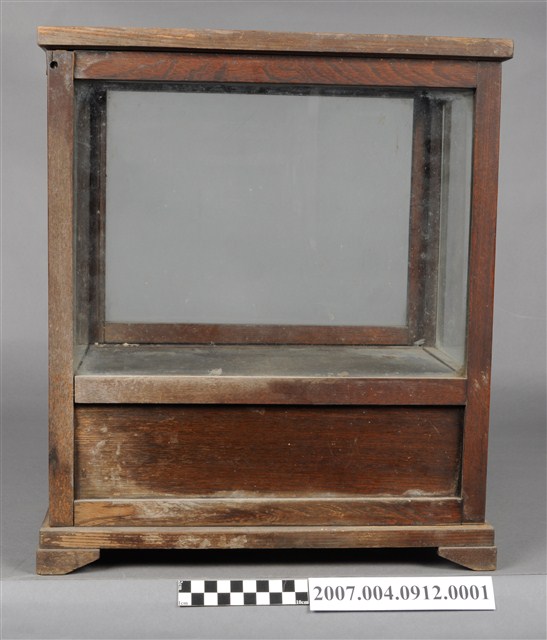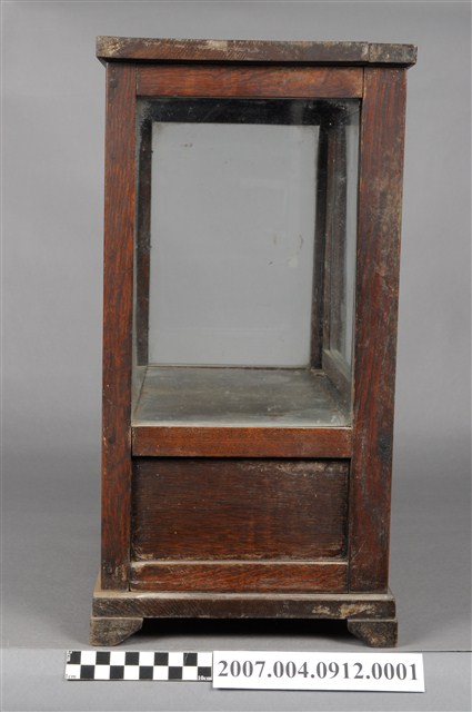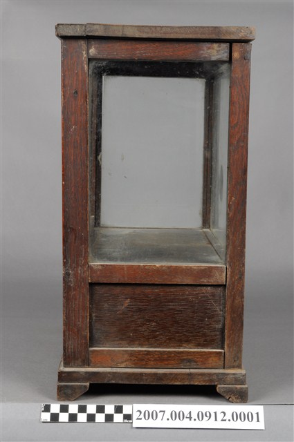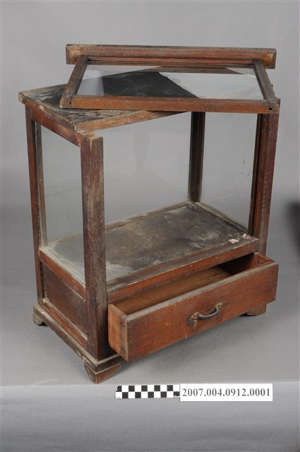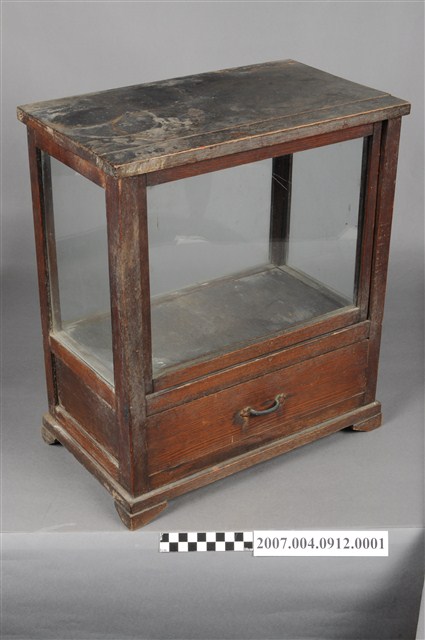 本物件為玻璃木櫃,該只木櫃上半部為四面透明玻璃構成,其中一面可抽起,應可放置天秤,下半部設計有一小抽屜,應可放置砝碼。該只木櫃略有使用痕跡,多處有髒污、擦傷或磨損,但保存尚稱完整。