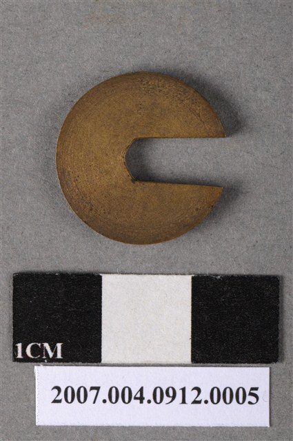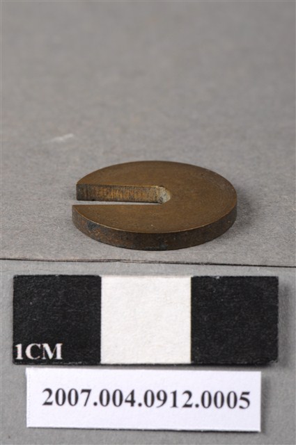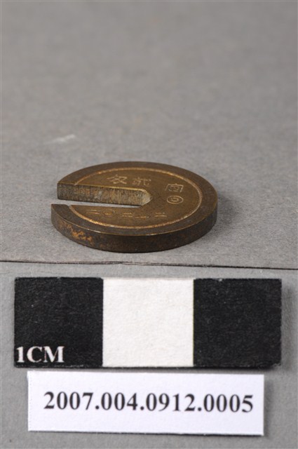 本物件為貮匁砝碼,外型呈現不完整的圓型,上刻著「貮匁」,下方刻著「二一二○二」,背面並無刻字。「匁」為日本度量衡的重量單位,約等於3.75公克,相當於中國的「錢」,約等於十分之一「兩」。