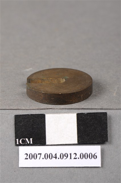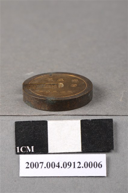 本物件為五匁砝碼,外型呈現不完整的圓型,上刻著「五匁」,下方刻著「二一二○二」,背面並無刻字。「匁」為日本度量衡的重量單位,約等於3.75公克,相當於中國的「錢」,約等於十分之一「兩」。