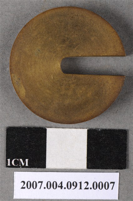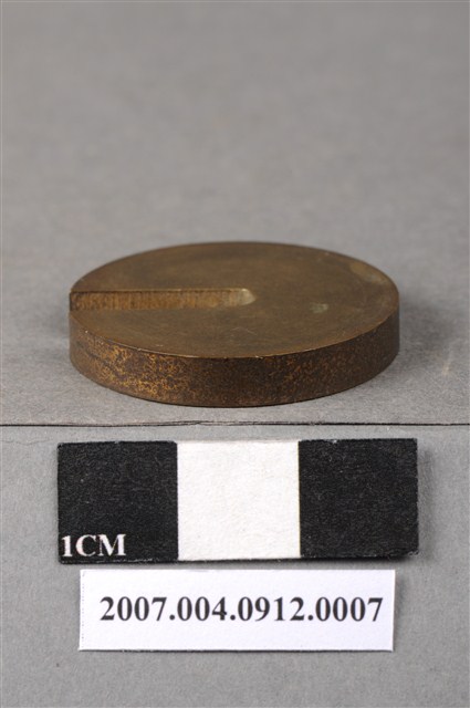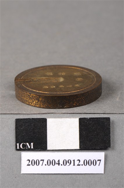 本物件為拾匁砝碼,外型呈現不完整的圓型,上刻著「拾匁」,下方刻著「二一二○二」,背面並無刻字。「匁」為日本度量衡的重量單位,約等於3.75公克,相當於中國的「錢」,約等於十分之一「兩」。