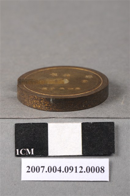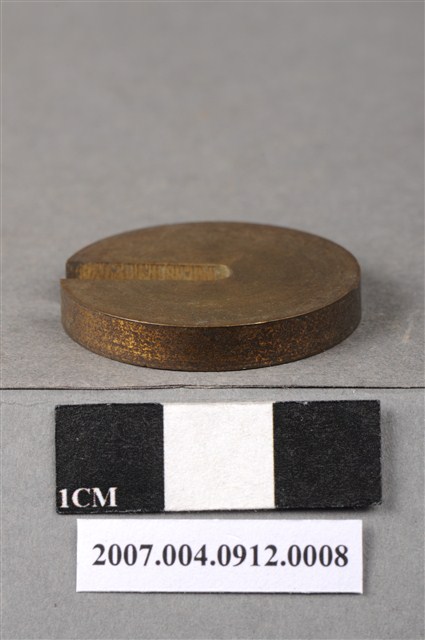 本物件為拾匁砝碼,外型呈現不完整的圓型,上刻著「拾匁」,下方刻著「二一二○二」,背面並無刻字。「匁」為日本度量衡的重量單位,約等於3.75公克,相當於中國的「錢」,約等於十分之一「兩」。