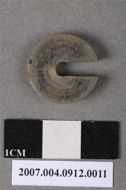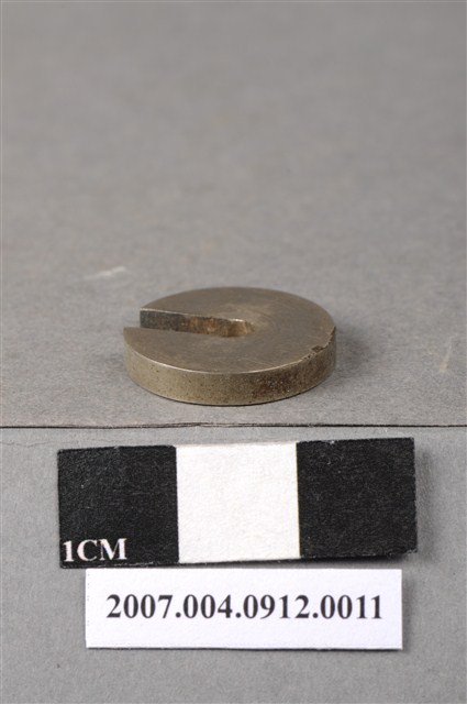 本物件為拾瓦砝碼,外型呈現不完整的圓型,上刻著「拾瓦」,下方刻著「二一二○二」,背面並無刻字,顏色較淺,底部略有使用刮傷痕跡。「瓦」為日本明治時期,度量衡重量單位「克」的意思。
