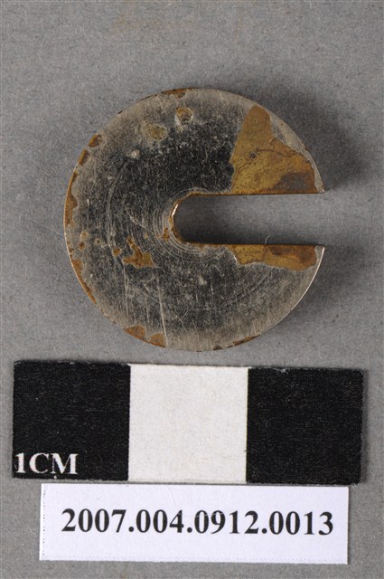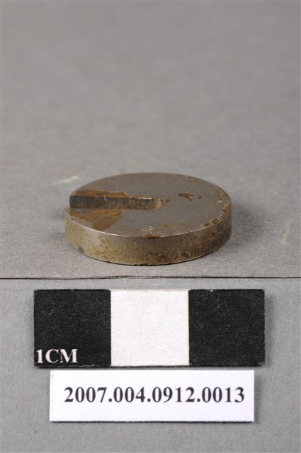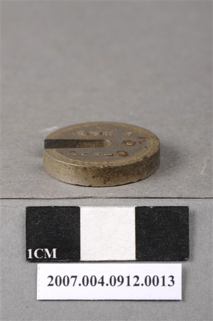本物件為貳拾瓦砝碼,外型呈現不完整的圓型,上刻著「貳拾瓦」,下方刻著「二一二○二」,背面並無刻字,顏色較淺,底部使用刮傷痕跡的情況略為嚴重。「瓦」為日本明治時期,度量衡重量單位「克」的意思。