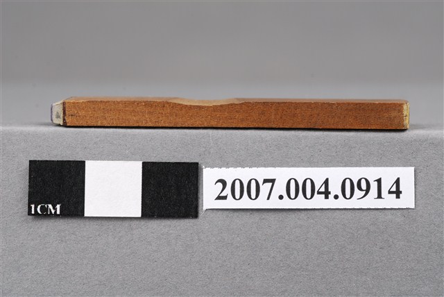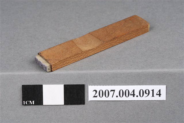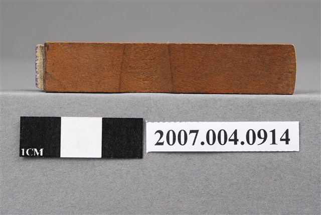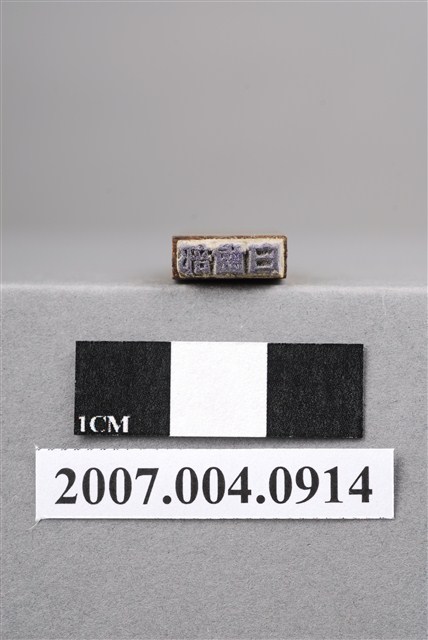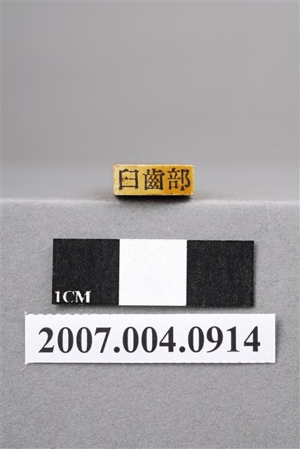 本物件為臼齒部印章,該只印章由木頭製成,呈長方形,中間部分略有凹陷以方便拿取使用,印章尾端寫有「臼齒部」三字以供辨識,前端部分仍留有些許使用過的藍色印泥痕跡,整體保持完整。