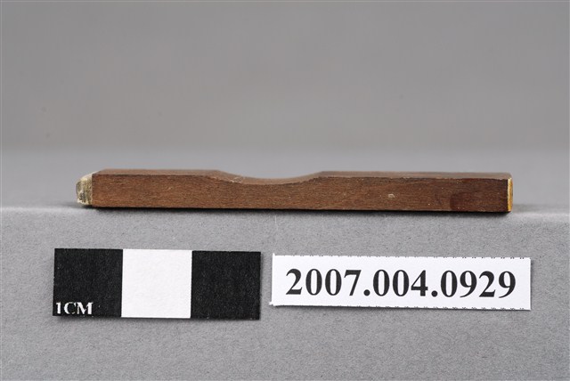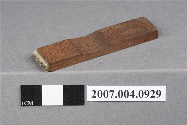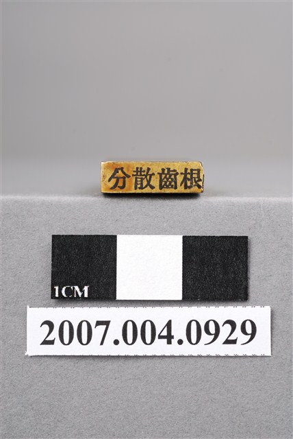本物件為分散齒根印章,該只印章由木頭製成,呈長方形,中間部分略有凹陷以方便拿取使用,印章尾端寫有「分散齒根」四字以供辨識,前端部分保持乾淨,較無使用過的藍色印泥痕跡,整體保持完整。