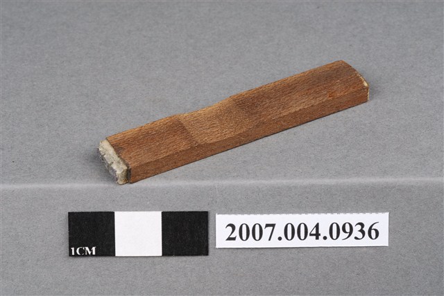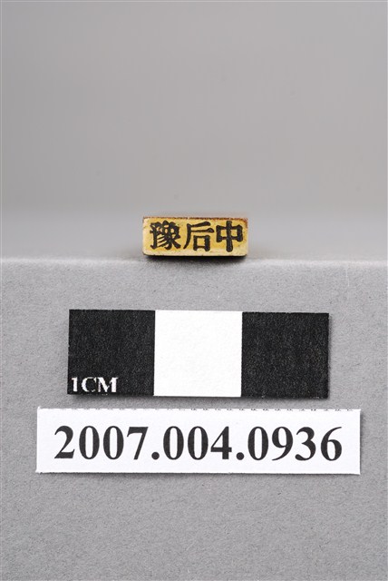 本物件為豫后中印章,該只印章由木頭製成,呈長方形,中間部分略有凹陷以方便拿取使用,印章尾端寫有「豫后中」三字以供辨識,前端部分保持乾淨,較無使用過的藍色印泥痕跡,整體保持完整。預後(Prognosis、outcomes)是一個醫學名詞,指根據病人當前狀況來推估未來經過治療後可能的結果。