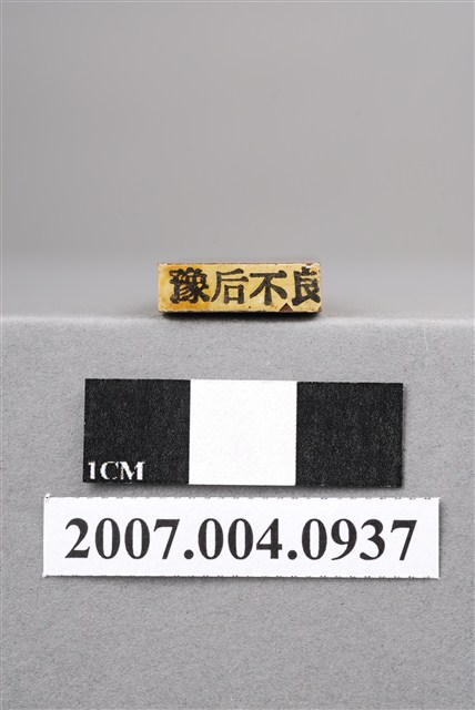 本物件為豫后不良印章,該只印章由木頭製成,呈長方形,中間部分略有凹陷以方便拿取使用,印章尾端寫有「豫后不良」四字以供辨識,前端部分仍留有些許使用過的藍色印泥痕跡,整體保持完整。預後(Prognosis、outcomes)是一個醫學名詞,指根據病人當前狀況來推估未來經過治療後可能的結果。