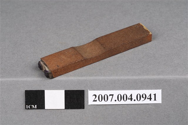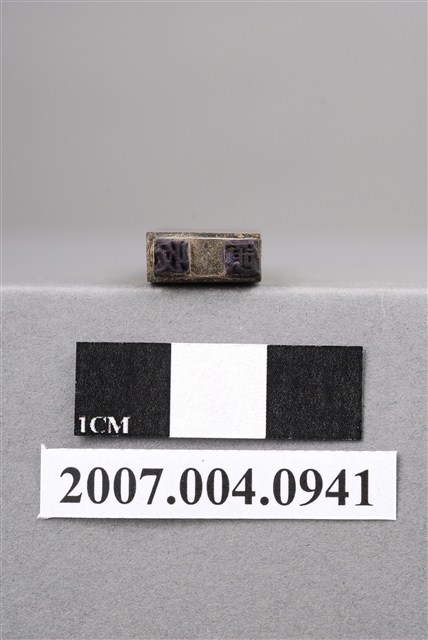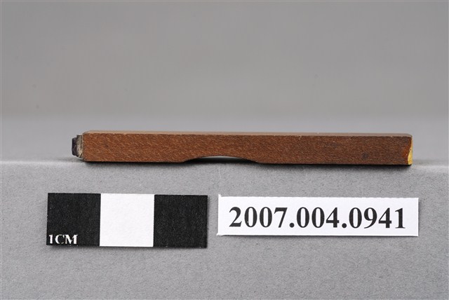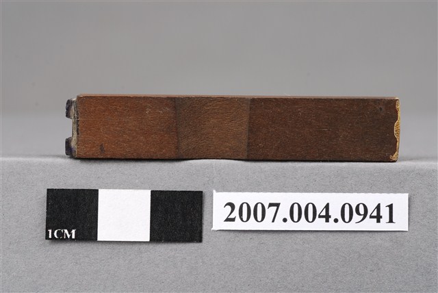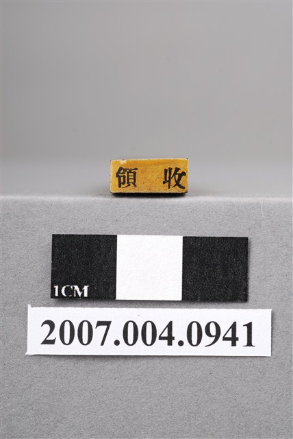本物件為領收印章,該只印章由木頭製成,呈長方形,中間部分略有凹陷以方便拿取使用,印章尾端寫有「領收」兩字以供辨識,前端部分仍留有些許使用過的藍色印泥痕跡,整體保持完整。領收,即收據之意。