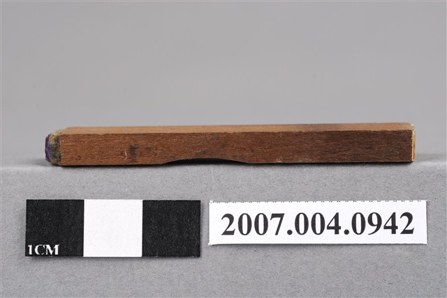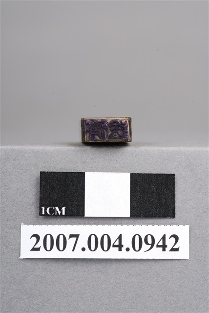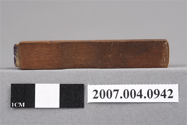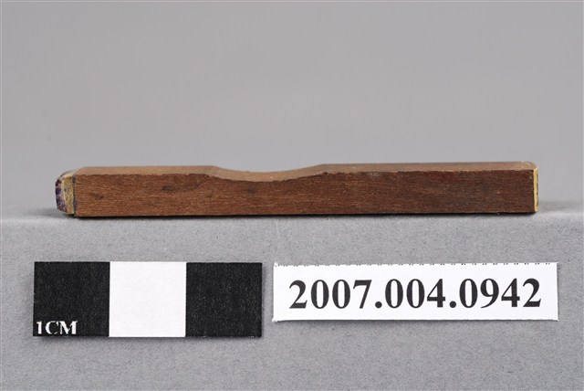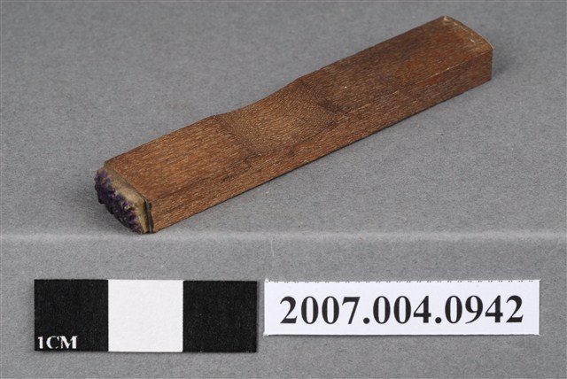本物件為送濟印章,該只印章由木頭製成,呈長方形,中間部分略有凹陷以方便拿取使用,印章尾端寫有「送濟」兩字以供辨識,前端部分仍留有些許使用過的藍色印泥痕跡,整體保持完整。