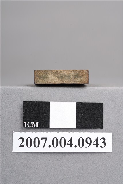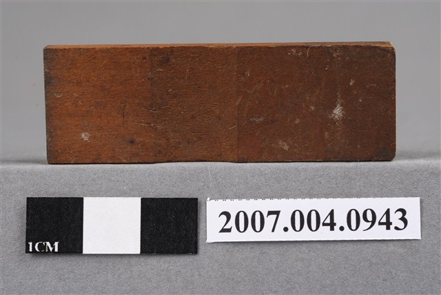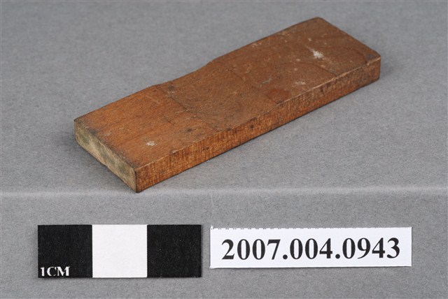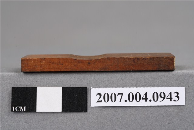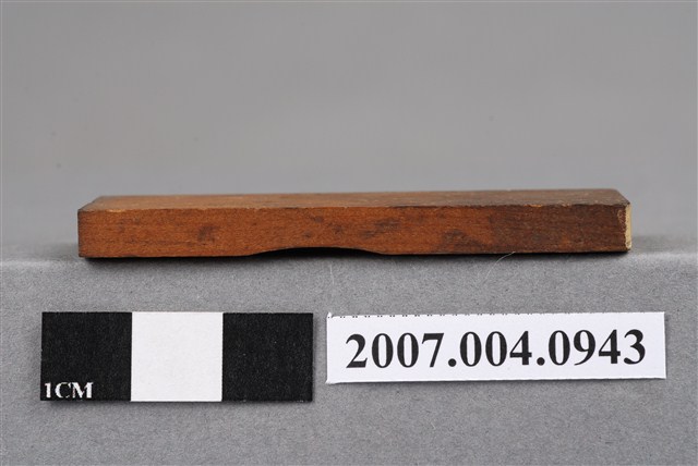 本物件為割引印章,該只印章由木頭製成,呈長方形,中間部分略有凹陷以方便拿取使用,印章尾端寫有「割引」兩字以供辨識,但前端的圖章部分已經脫落消失,僅能從尾端字樣判斷出印章用途。割引,即折價。