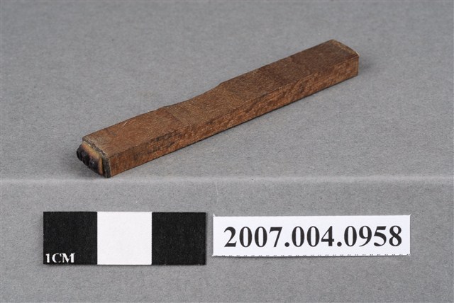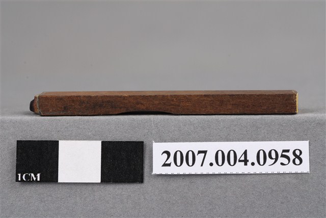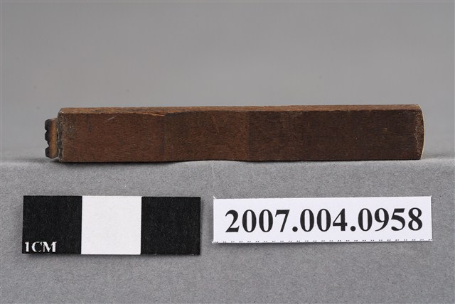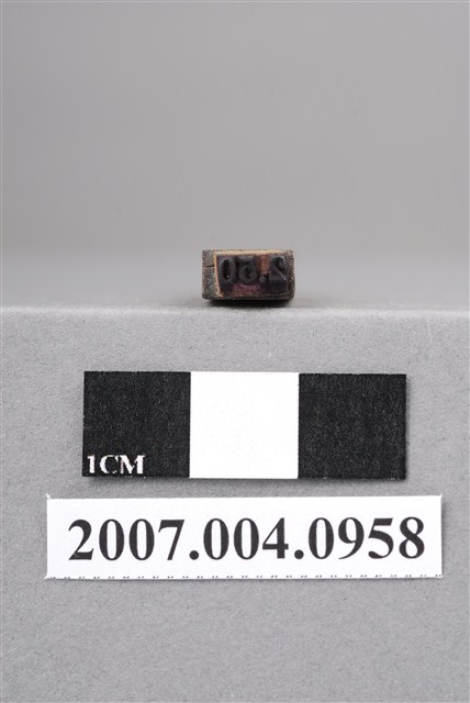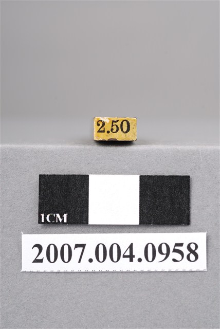本物件為2.50印章,該只印章由木頭製成,呈長方形,中間部分略有凹陷以方便拿取使用,印章尾端寫有「2.50」等數字與符號以供辨識,前端部分仍留有些許使用過的藍色印泥痕跡,整體保持完整。