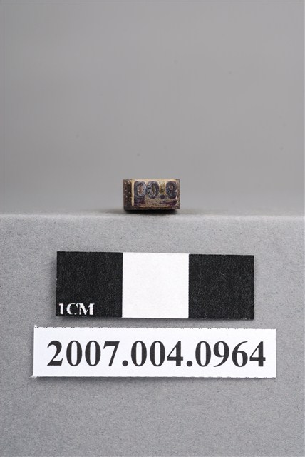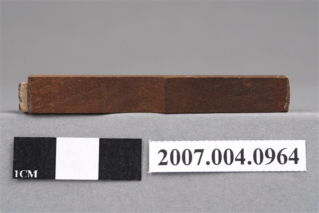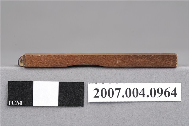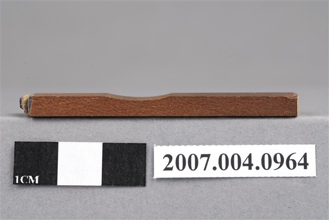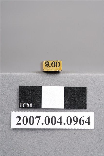 本物件為9.00印章,該只印章由木頭製成,呈長方形,中間部分略有凹陷以方便拿取使用,印章尾端寫有「9.00」等數字與符號以供辨識,前端部分保持乾淨,較無使用過的藍色印泥痕跡,整體保持完整。