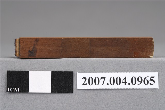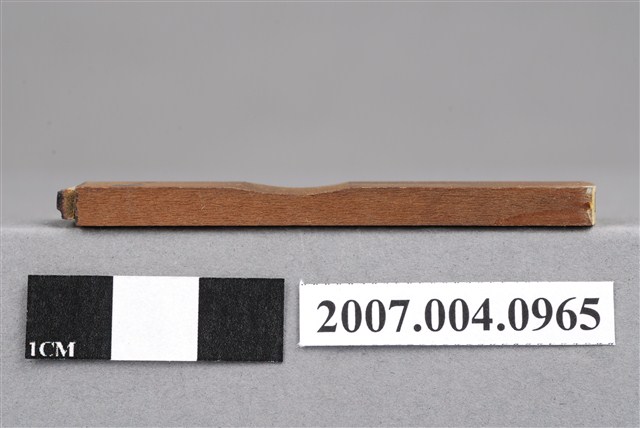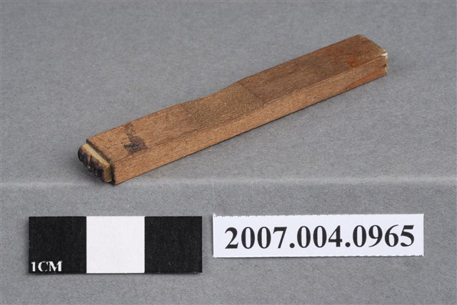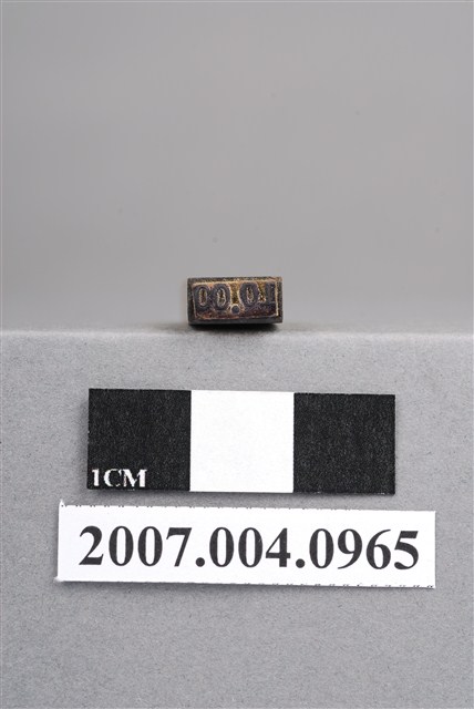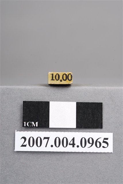 本物件為10.00印章,該只印章由木頭製成,呈長方形,中間部分略有凹陷以方便拿取使用,印章尾端寫有「10.00」等數字與符號以供辨識,前端部分仍留有些許使用過的藍色印泥痕跡,整體保持完整。