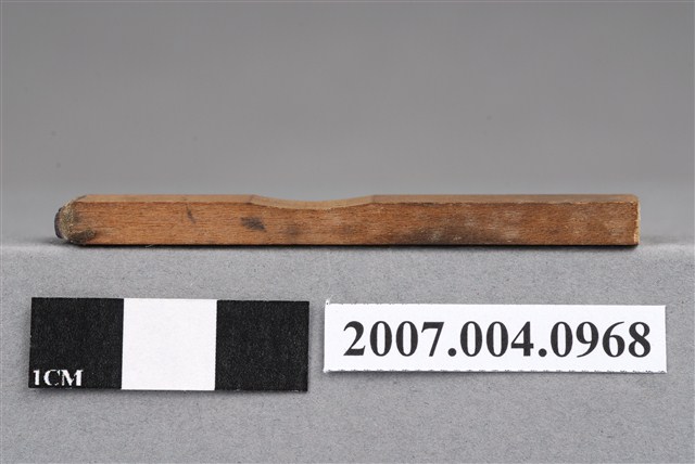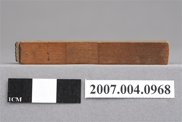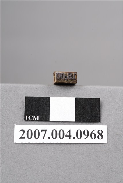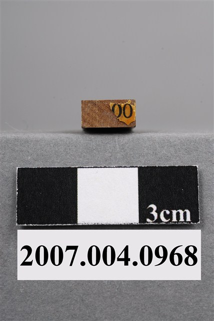 本物件為13.00印章,該只印章由木頭製成,呈長方形,中間部分略有凹陷以方便拿取使用,印章尾端寫有「13.00」等數字與符號以供辨識,雖剝落缺損略為嚴重,但尚可由前端印泥部分辨識出數字,前端部分仍留有些許使用過的藍色印泥痕跡,整體保持完整。