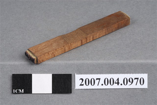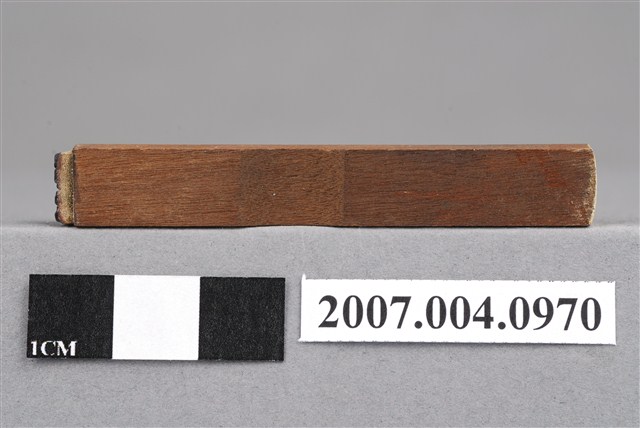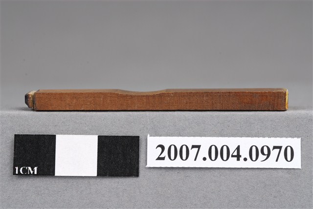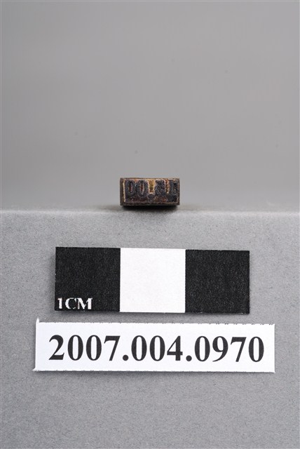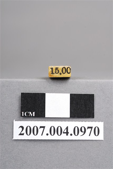 本物件為15.00印章,該只印章由木頭製成,呈長方形,中間部分略有凹陷以方便拿取使用,印章尾端寫有「15.00」等數字與符號以供辨識,前端部分仍留有些許使用過的藍色印泥痕跡,整體保持完整。