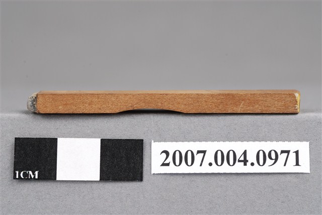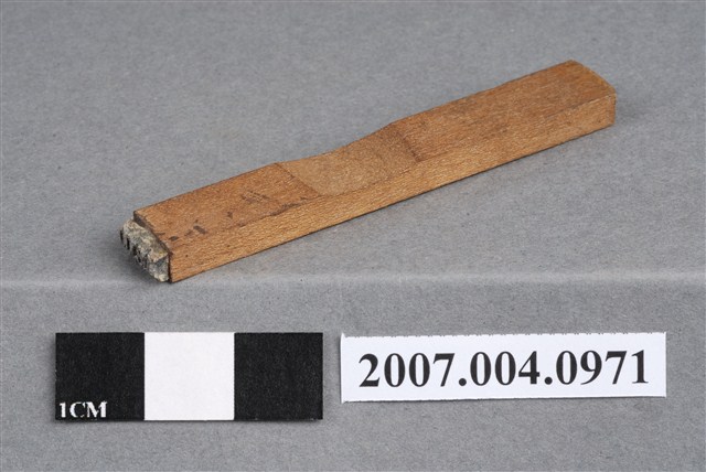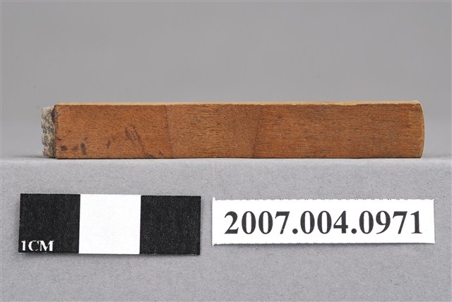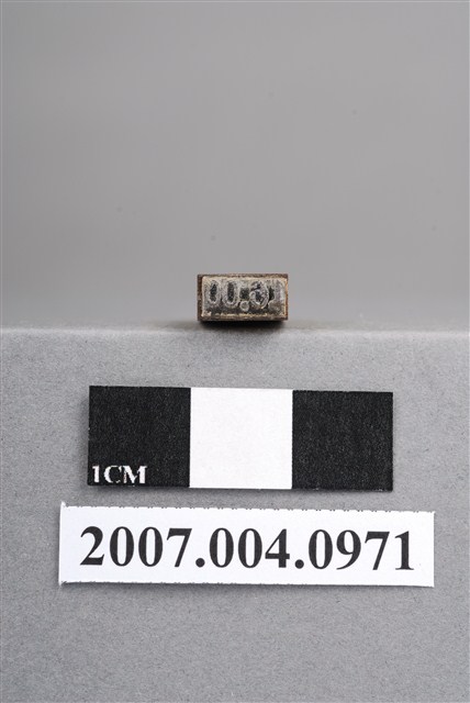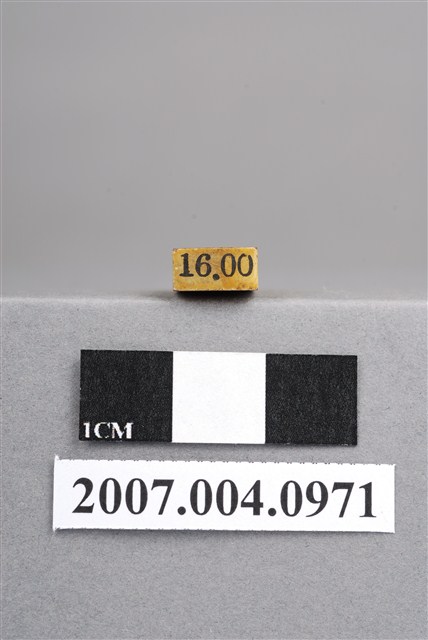 本物件為16.00印章,該只印章由木頭製成,呈長方形,中間部分略有凹陷以方便拿取使用,印章尾端寫有「16.00」等數字與符號以供辨識,前端部分保持乾淨,較無使用過的藍色印泥痕跡,整體保持完整。