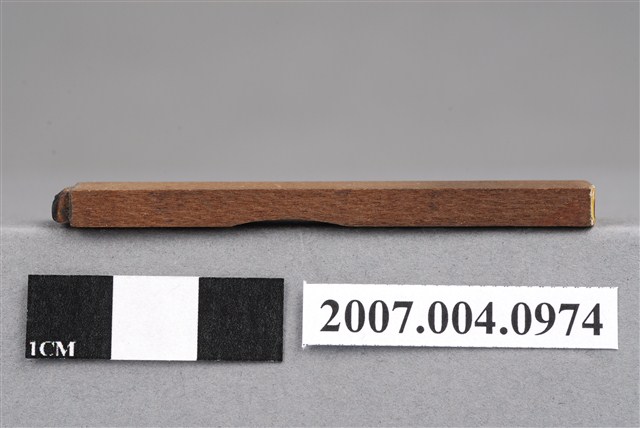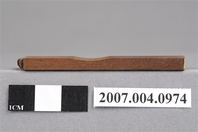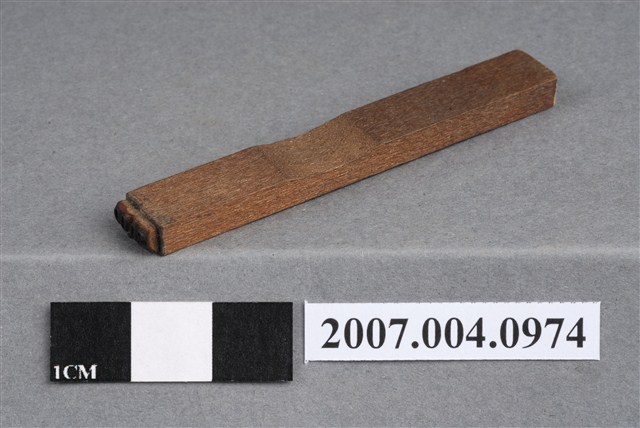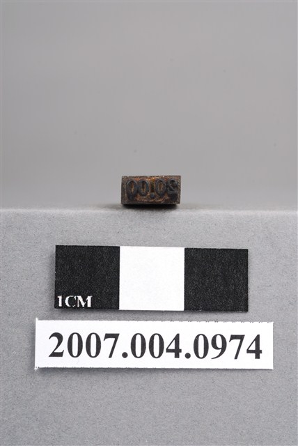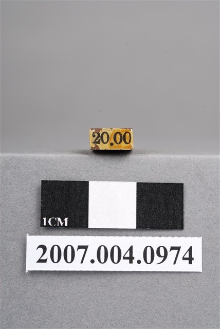 本物件為20.00印章,該只印章由木頭製成,呈長方形,中間部分略有凹陷以方便拿取使用,印章尾端寫有「20.00」等數字與符號以供辨識,略有剝落缺損但尚可辨識出數字,前端部分仍留有些許使用過的藍色印泥痕跡,整體保持完整。