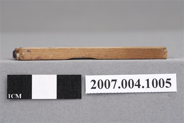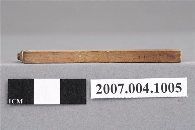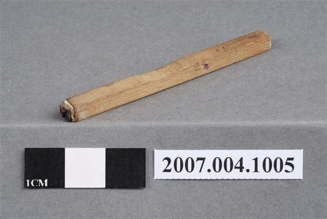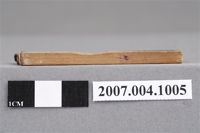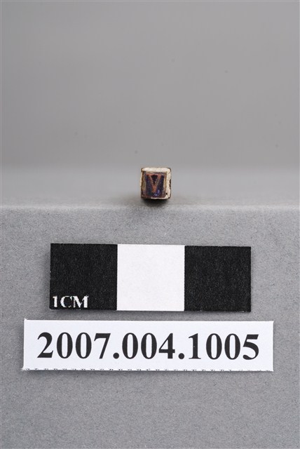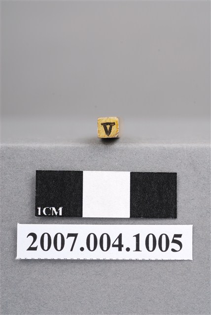 本物件為V印章,長方體狀,木質材質。該印章刻字處同為木質,刻有「V」字樣,雕刻方式為陽刻,有使用痕跡。
