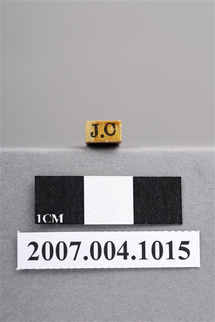 本物件為J.C印章,長方體狀,木質材質。該印章刻字處同為木質,刻有「J.C」字樣,雕刻方式為陽刻,有使用痕跡。