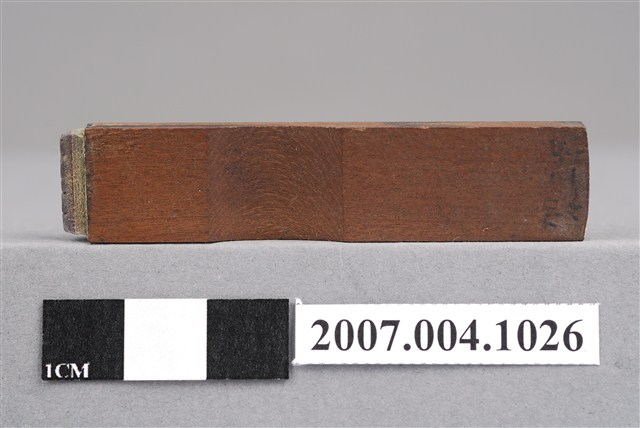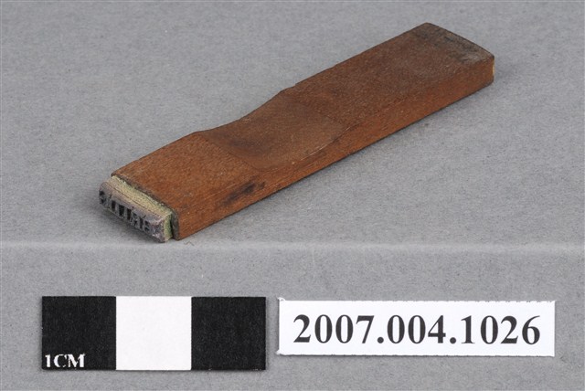 本物件為BRIDG印章,長方體狀,木質材質。該印章刻字處同為木質,刻有「BRIDG」字樣,雕刻方式為陽刻,有使用痕跡,側邊有黑色手寫「架□」字樣。BRIDG,日語為架腳。