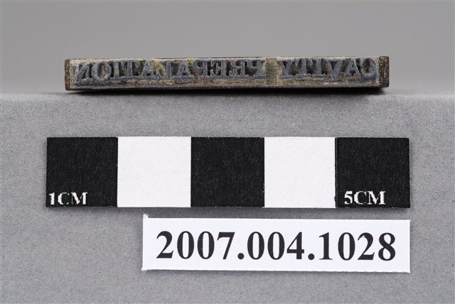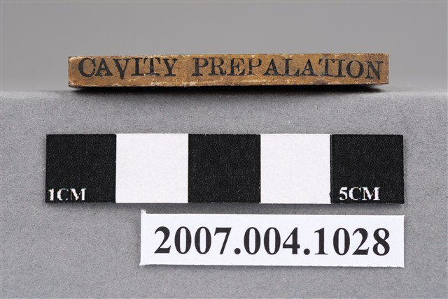 本物件為CAVITY PREPALATION印章,長方體狀,木質材質。該印章刻字處同為木質,刻有「CAVITY PREPALATION」字樣,雕刻方式為陽刻,有使用痕跡,側邊有黑色手寫「窩洞形成」字樣。