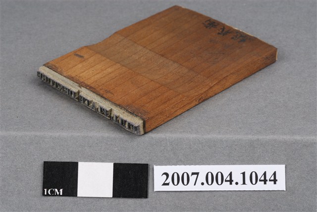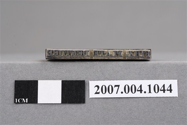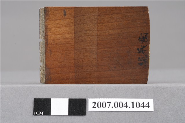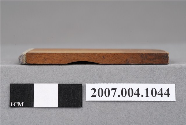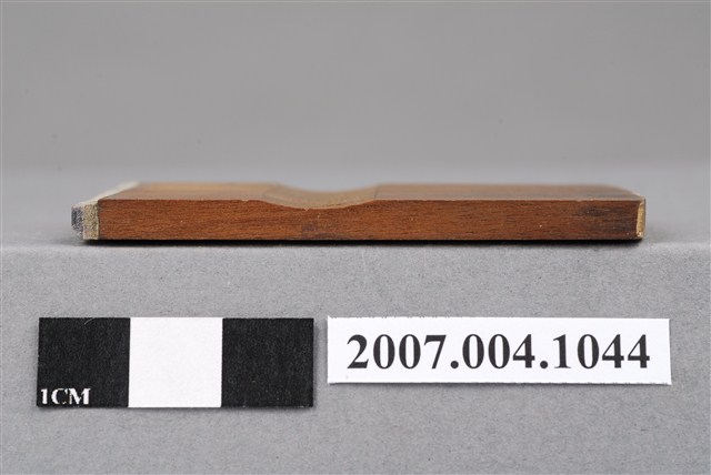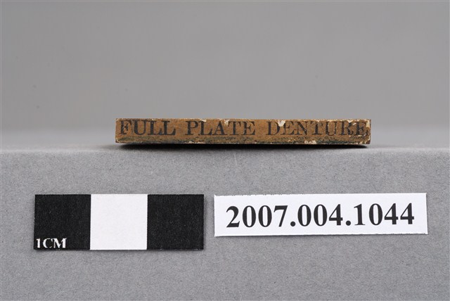本物件為FULL PLATE DENTURE印章,長方體狀,木質材質。該印章刻字處同為木質,刻有「FULL PLATE DENTURE」字樣,雕刻方式為陽刻,有使用痕跡,側邊有黑色手寫「□義齒」字樣。日文為「總義齒」,牙科常用術語為「全口假牙」。