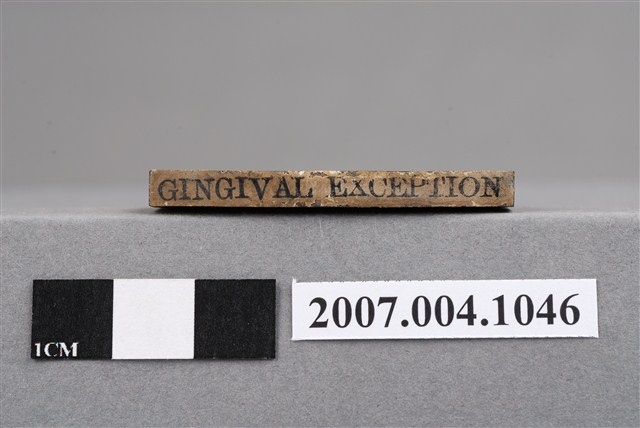 本物件為GINGIVAL EXCEPTION印章,長方體狀,木質材質。該印章刻字處同為木質,刻有「GINGIVAL EXCEPTION」字樣,雕刻方式為陽刻,有使用痕跡,側邊有黑色手寫「齒齦辨除去」。