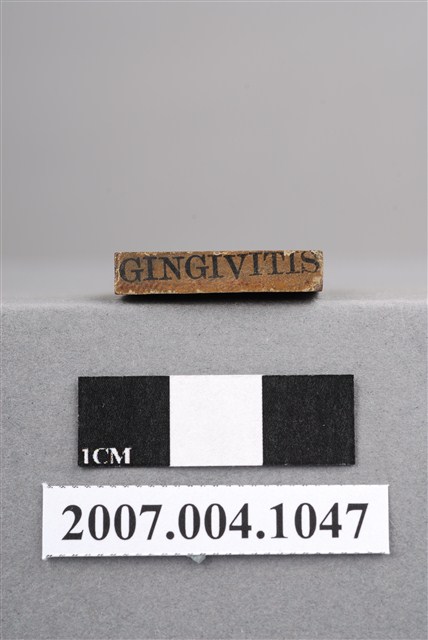 本物件為GINGIVITIS印章,長方體狀,木質材質。該印章刻字處同為木質,刻有「GINGIVITIS」字樣,雕刻方式為陽刻,有使用痕跡,側邊有黑色手寫「齒齦炎」。