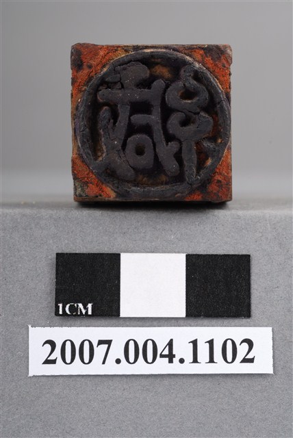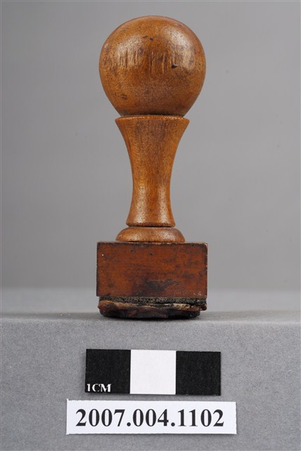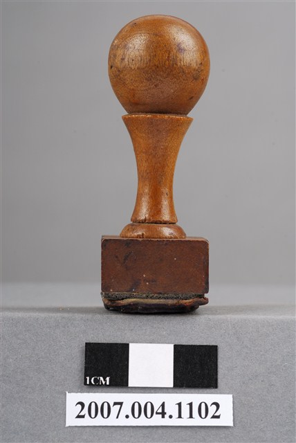 本物件為緘字印章,木質材質。印紐為圓珠狀,下方為曲線延伸至方形刻印端,底部為橘色橡膠,刻印字樣為一圓型內有「緘」字樣,雕刻方式為陽刻,有使用痕跡。