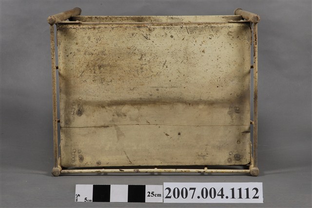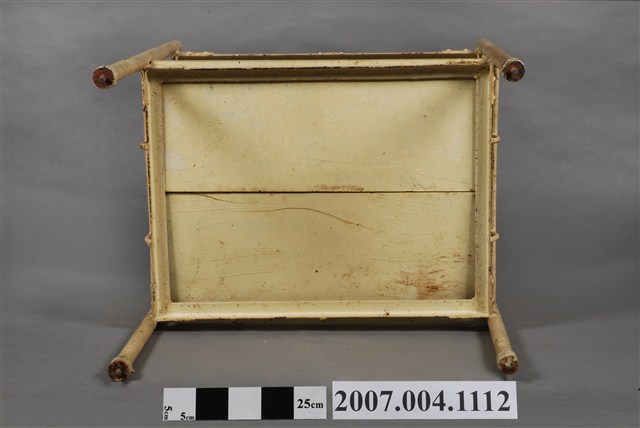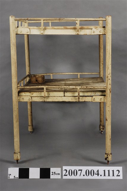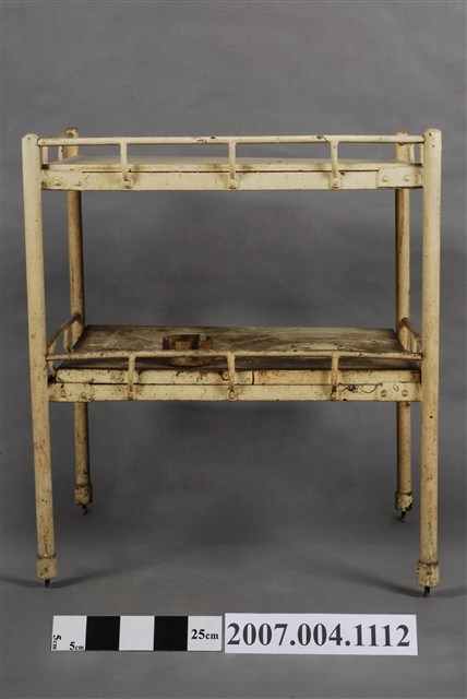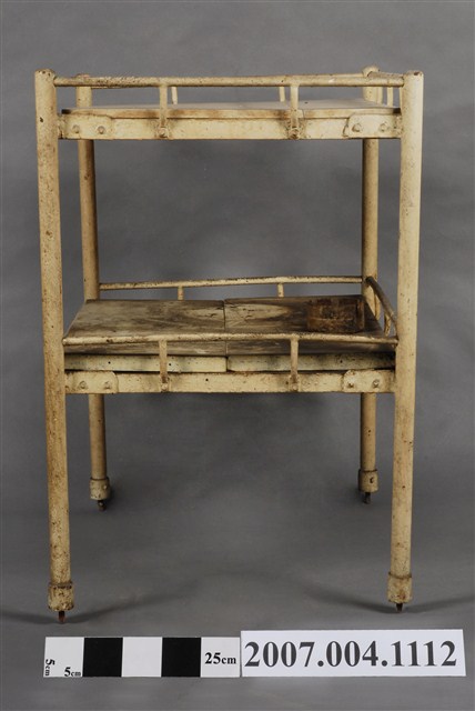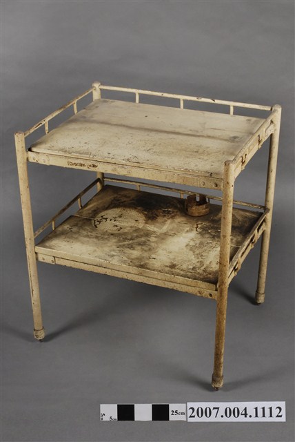 本物件為置物架。置物架為金屬製品,外觀似淡黃色,有生鏽。有兩層檯面,檯面周圍三面有架子,可防止物品掉落。工作臺有4個腳。第二層檯面上有一圓底物品。