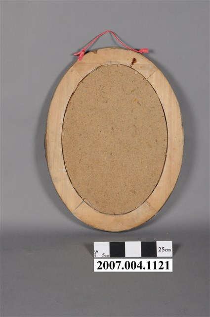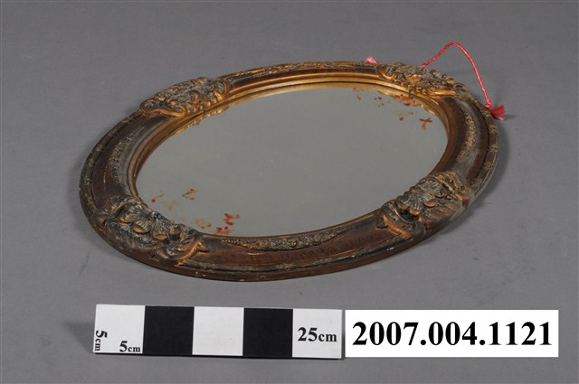 本物件為鏡子,材質為金屬,形狀為橢圓形,邊框刻有紋飾呈現黃銅色,鏡面上方印有「祝大廈落成」;下方印有「虎尾張和□敬賀」之字樣。鏡子背面材質為木頭。