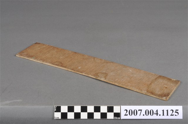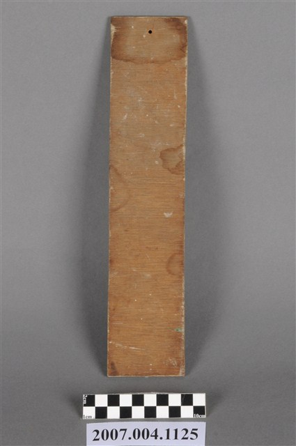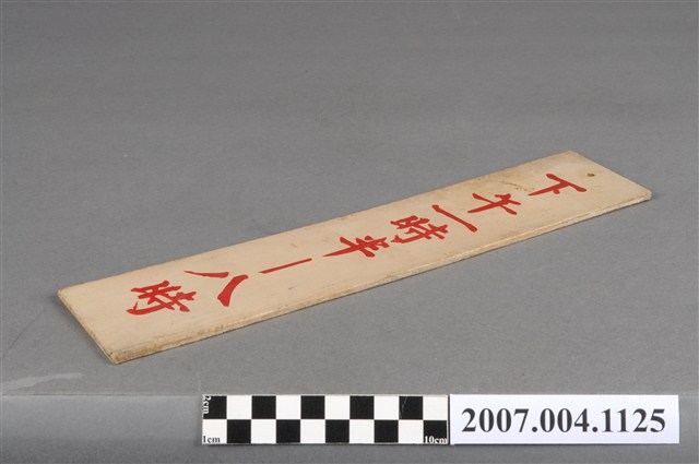 本物件為看診時間掛牌,材質為木質,形狀為長方形,掛牌正面印有紅色「下午1時半–8時」之字樣,且掛牌上留有裝訂痕跡;掛牌背面有汙損痕跡。