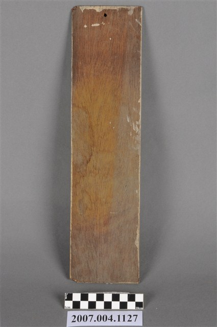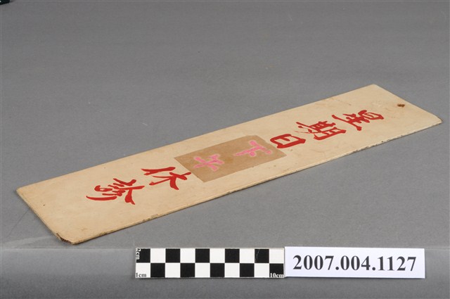 本物件為休診時間掛牌,材質為木質,形狀為長方形,掛牌正面印有紅色「星期日下午休診」之字樣,其中下午2字之處為後來所修改,且掛牌上留有裝訂痕跡;掛牌背面有斑駁痕跡。