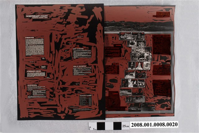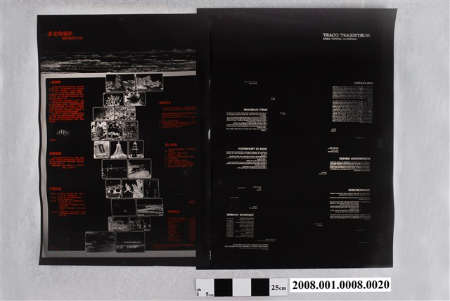 本物件是製作「東北角海岸國定風景特定區」地圖背面的印刷製版用網片之一,地圖比例尺5萬分之1,由師大地理系吳信政編繪,1991年交通部觀光局東北角海岸國定風景特定區管理處再版發行。 本網片為陰片,內容地圖背面的簡介,組合宣傳圖片和宣傳中、英文字。成圖繪製範圍為臺灣東北角海陸域,大約北起南雅,南至北港口(外澳稍南)。附圖在右上角,為東北角在臺灣的位置圖,背面為相片及文字說明。