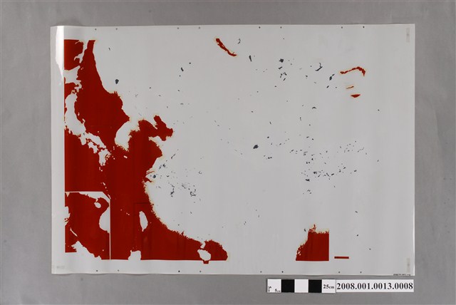 本物件是吳信政教授製作〈中華民國〉地圖印刷製版用膠片之一。成圖比例尺四百八十五萬分之一,編繪者為吳信政、邱淑敏、林翠珣、陳美雲,1989年8月由甘霖出版社出版。