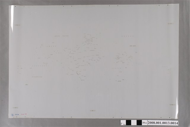 本物件是吳信政教授製作〈世界全圖〉印刷製版用膠片之一,成圖比例尺兩千五百萬分之一,編繪者為吳信政、邱淑敏,1989年8月由甘霖出版社出版。館藏號2008.001.0045為其印刷成品。